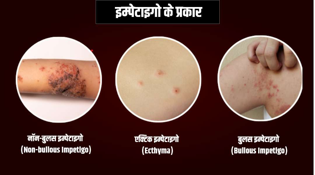 नॉन-बुलस इम्पेटाइगो (Non-bullous Impetigo) : यह इम्पेटाइगो का सबसे सामान्य प्रकार है, जो विशेष रूप से बच्चों में अधिक देखने को मिलता है। इसमें त्वचा पर पहले लाल रंग के छोटे दाने या चकत्ते बनते हैं, जो कुछ समय बाद फफोले का रूप ले लेते हैं। ये फफोले जल्दी ही फट जाते हैं और उनकी जगह पीले या सुनहरे रंग की सूखी पपड़ी जम जाती है। यह संक्रमण आमतौर पर खुजली और हल्की जलन के साथ होता है और जल्दी फैल सकता है।