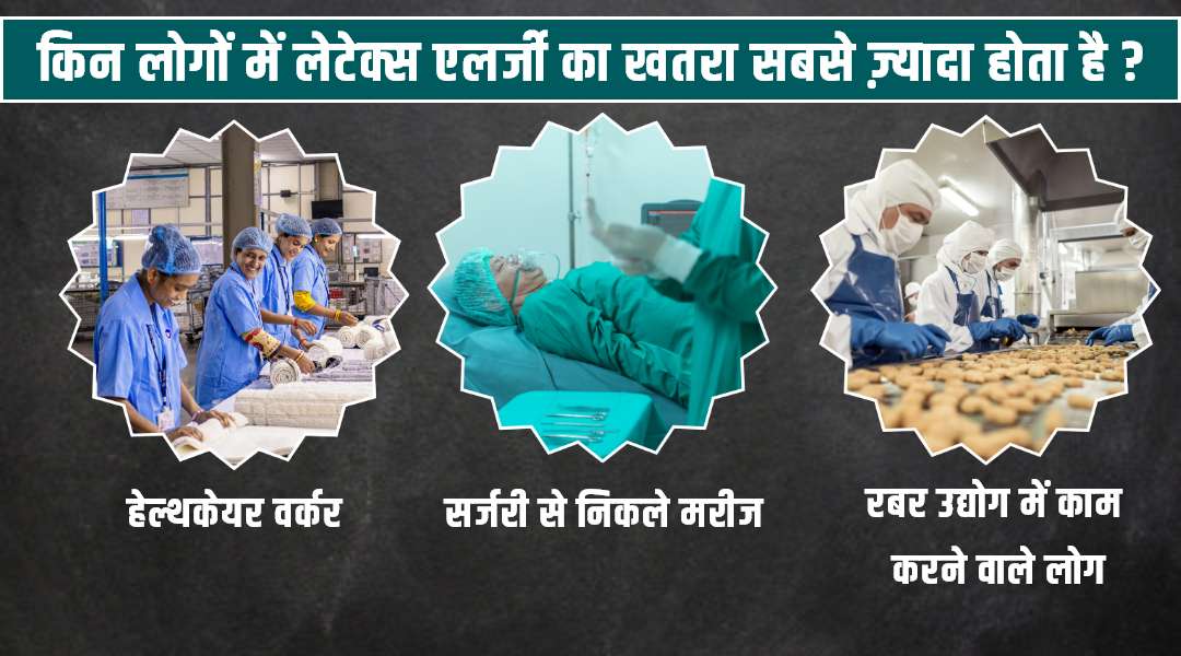 - 1.*हेल्थकेयर वर्कर* :– डॉ, लैब टेक्नीशियन, जो बार-बार लेटेक्स दस्ताने का उपयोग करते हैं।